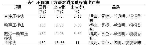 通過四種壓榨方法對貓屎瓜籽出油情況的研究發(fā)現(xiàn),貓屎瓜籽因其種皮厚,存在壓榨不充分的現(xiàn)象,無論直接壓榨法、蒸炒—粉碎壓榨法還是粉碎壓榨法都不能使貓屎瓜籽達到充分出油的目的,直接壓榨法的出油率最低,僅為2.40%;而使用冷榨法可以使貓屎瓜籽比較充分的出油,出油率為11%[4],達到提高出油率的目的。
