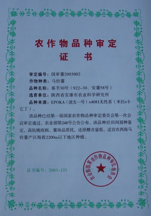 秦芋30號(922-30、安薯58號)。系安康市農(nóng)科所利用馬鈴薯品種EPOKA(波友一號)作母本,4081無性系(米拉×卡丁它)作父本雜交實生苗株系選育而成,原代號922-30.20019月通過陜西省農(nóng)作物品種審定委員會審定,定名為安薯58號。200328日經(jīng)第一屆國家農(nóng)作物品種審定委員會第一次會議審定通過,農(nóng)業(yè)部第248號公告公布,定名為秦芋30號,審定編號:國審薯2003002.20039月國家科技部、農(nóng)業(yè)部公布為《優(yōu)質(zhì)專用農(nóng)作物新品種》之列,并納入國家“863”計劃管理。