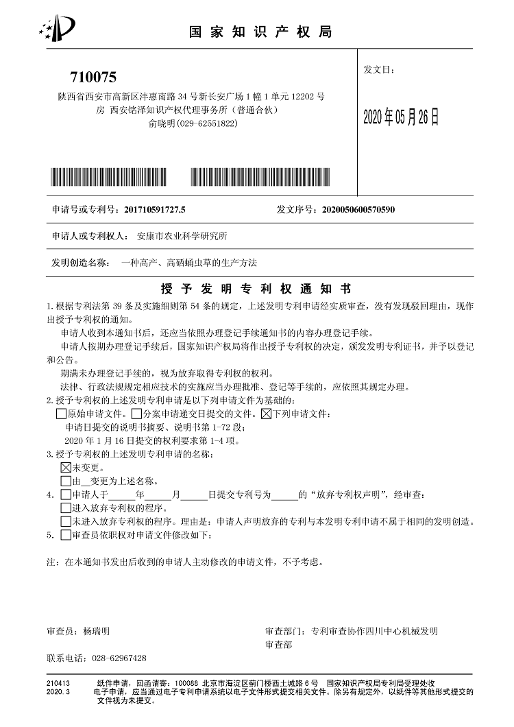 近日,我院食用菌研究所發(fā)明專利《一種高產(chǎn)、高硒蛹蟲草的生產(chǎn)方法》獲得了國家知識產(chǎn)權(quán)局授權(quán),專利號為ZL201710591727.5。本發(fā)明提供了一種高產(chǎn)、高硒蛹蟲草的生產(chǎn)方法,用該方法生產(chǎn)的蛹蟲草能大幅度提高蛹蟲草子座的硒含量,從而提高蛹蟲草的營養(yǎng)和藥用價值。