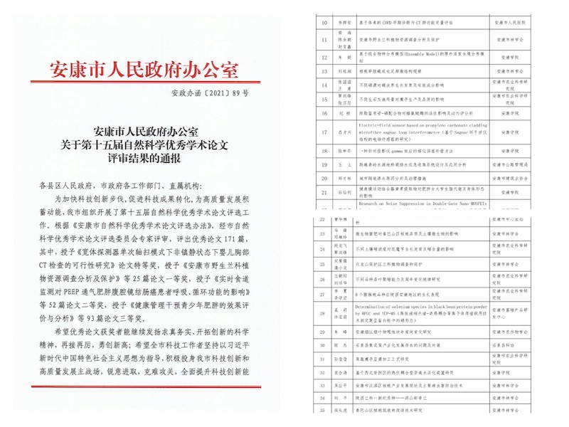2021年,發(fā)表學術論文9篇,參加安康市第十五屆自然科學優(yōu)秀學術論文評選,獲獎13篇