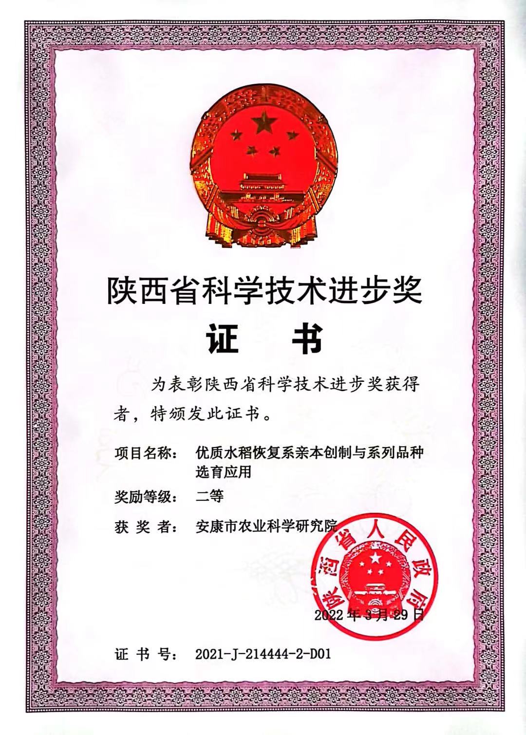 由安康市農(nóng)業(yè)科學(xué)研究院主持,漢中現(xiàn)代農(nóng)業(yè)科技有限公司、陜西華盛種業(yè)科技有限公司參研的“優(yōu)質(zhì)水稻恢復(fù)系親本創(chuàng)制與系列品種選育應(yīng)用”項目榮獲2021年度陜西省科學(xué)技術(shù)進(jìn)步二等獎,這是我院近30年來在科技創(chuàng)新領(lǐng)域擁有自主知識產(chǎn)權(quán)的最高獎項。