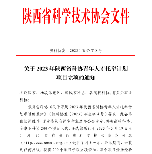 據(jù)悉,陜西省科協(xié)青年人才托舉計(jì)劃項(xiàng)目由陜西省科學(xué)技術(shù)協(xié)會(huì)設(shè)立,旨在強(qiáng)化對(duì)青年人才的舉薦培優(yōu),通過項(xiàng)目扶持一批年齡在32周歲(女性35周歲)以下的省內(nèi)一線科技工作者,指導(dǎo)青年人才夯實(shí)科研基礎(chǔ),扶持青年人才逐步成長(zhǎng)為優(yōu)秀科技人才。
