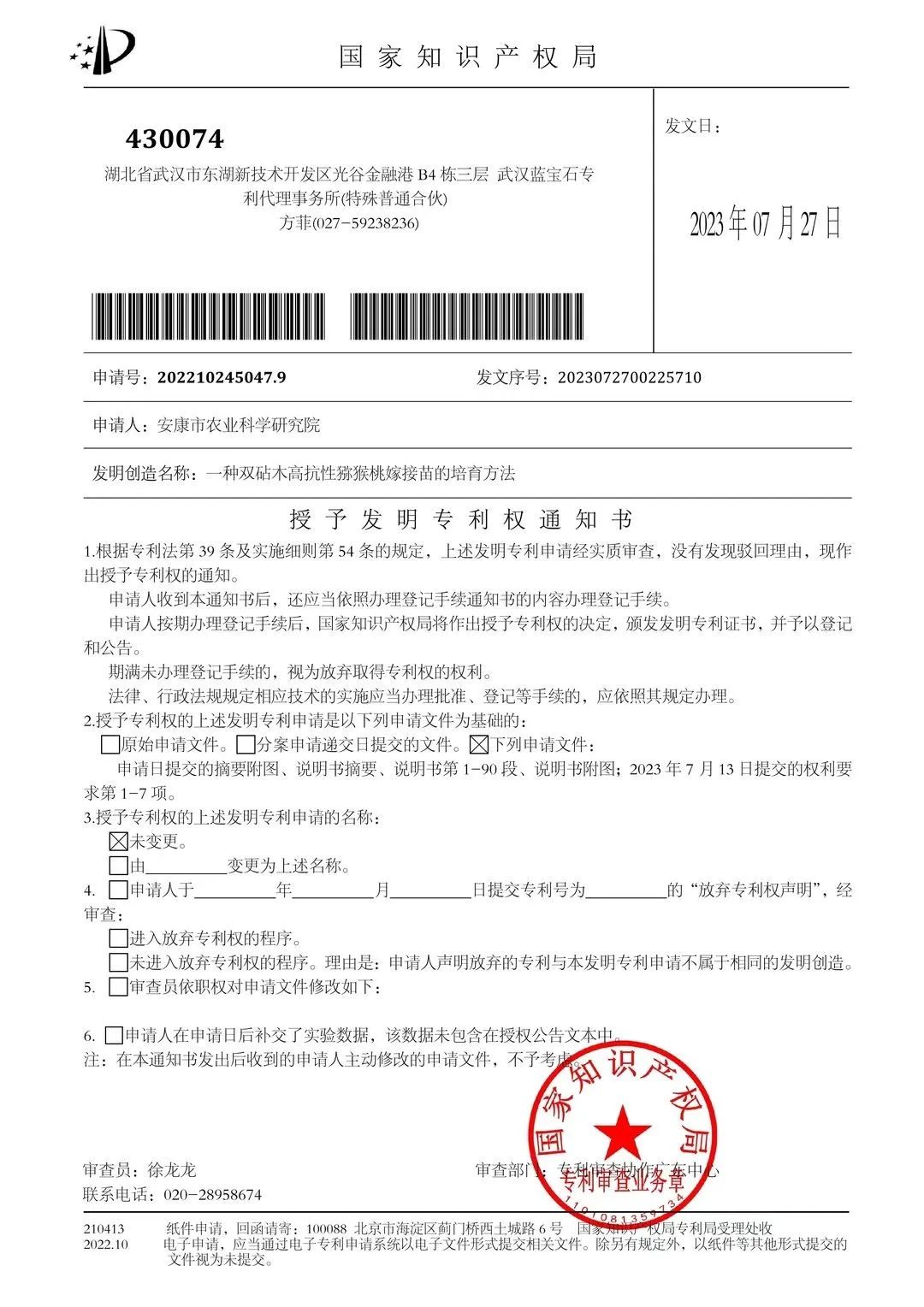 近日,安康市農(nóng)科院發(fā)明專利“一種雙砧木高抗性獼猴桃嫁接苗的培育方法”獲得授權(quán)。