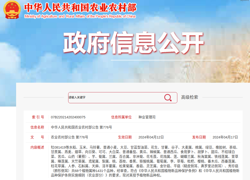 近日,農(nóng)業(yè)農(nóng)村部官網(wǎng)發(fā)布了《中華人民共和國農(nóng)業(yè)農(nóng)村部公告》(第776號),對68個植物屬種1431個品種授予植物新品種權(quán),安康市農(nóng)科院選育的水稻品種“秦康銀絲”位于其中。