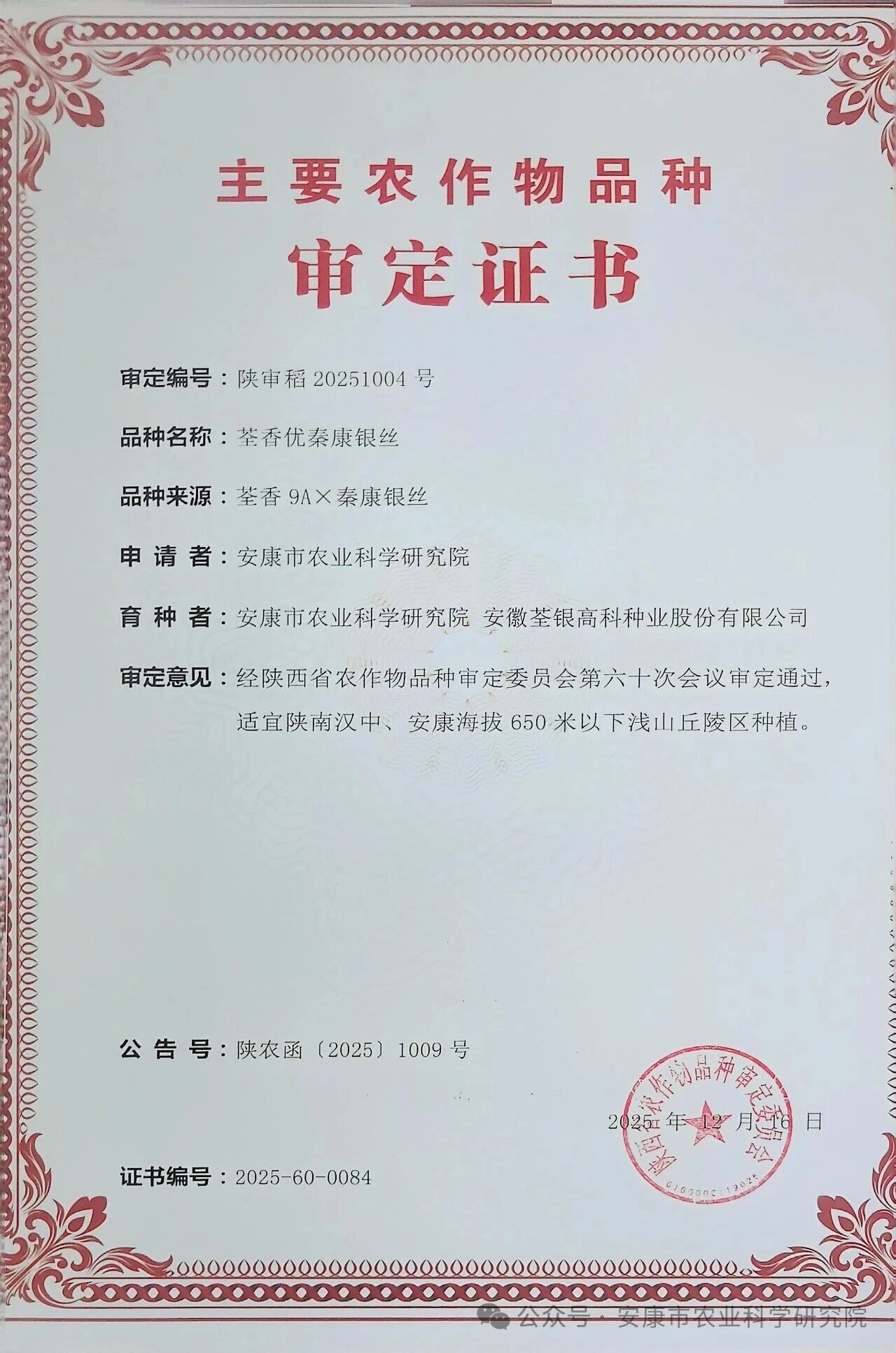 水稻新品種原香優(yōu)秦康銀絲’‘荃香優(yōu)秦康銀絲均為秈型三系雜交水稻,專門適配陜南漢中、安康淺山丘陵區(qū)種植。契合高海拔和中低海拔區(qū)域種植,可充分利用當(dāng)?shù)毓鉄豳Y源。水稻原香優(yōu)秦康銀絲屬于秈型三系雜交水稻品種。全生育期152.1天,株高104.3厘米,穗長(zhǎng)23.2厘米,每畝有效穗數(shù)18.6萬(wàn)穗,每穗實(shí)粒數(shù)165.9粒,結(jié)實(shí)率85.4%,千粒重20.9克,糙米率78.2%,整精米率59.9%,粒長(zhǎng)6.9毫米,長(zhǎng)寬比3.7,堊白度0.4%,透明度1級(jí),堿消值7.0級(jí),膠稠度64毫米,直鏈淀粉含量17.4%,達(dá)到農(nóng)業(yè)行業(yè)《食用稻品種品質(zhì)》(NY/T 593-2021)標(biāo)準(zhǔn)一等。中抗稻曲病,中感稻瘟病、紋枯病和白葉枯病。適宜陜南漢中、安康海拔650米以上淺山丘陵區(qū)種植。兩年區(qū)試平均畝產(chǎn)546.5公斤,生產(chǎn)試驗(yàn)平均畝產(chǎn)549.4公斤。 水稻荃香優(yōu)秦康銀絲屬于秈型三系雜交水稻品種。全生育期149.0天,株高115.2厘米,穗長(zhǎng)24.2厘米,每畝有效穗數(shù)17.7萬(wàn)穗,每穗實(shí)粒數(shù)172.8粒,結(jié)實(shí)率84.6%,千粒重23.7克,糙米率79.3,整精米率55.6%,粒長(zhǎng)7毫米,長(zhǎng)寬比3.7,堊白度0.6%,透明度1級(jí),堿消值6.8級(jí),膠稠度76毫米,直鏈淀粉含量17%。達(dá)到農(nóng)業(yè)行業(yè)《食用稻品種品質(zhì)》(NY/T 593-2021)標(biāo)準(zhǔn)二等??沟厩。邪兹~枯病,中感稻瘟病和紋枯病。適宜陜南漢中、安康海拔650米以下淺山丘陵區(qū)種植。兩年區(qū)試平均畝產(chǎn)686.4公斤,生產(chǎn)試驗(yàn)平均畝產(chǎn)688.3公斤。
