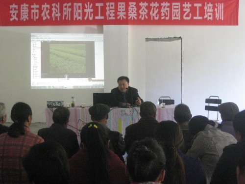 安康市農(nóng)業(yè)局副局長(zhǎng)郭達(dá)彥親臨“農(nóng)科所陽(yáng)光工程果桑茶花藥園藝工培訓(xùn)班”現(xiàn)場(chǎng)指導(dǎo)