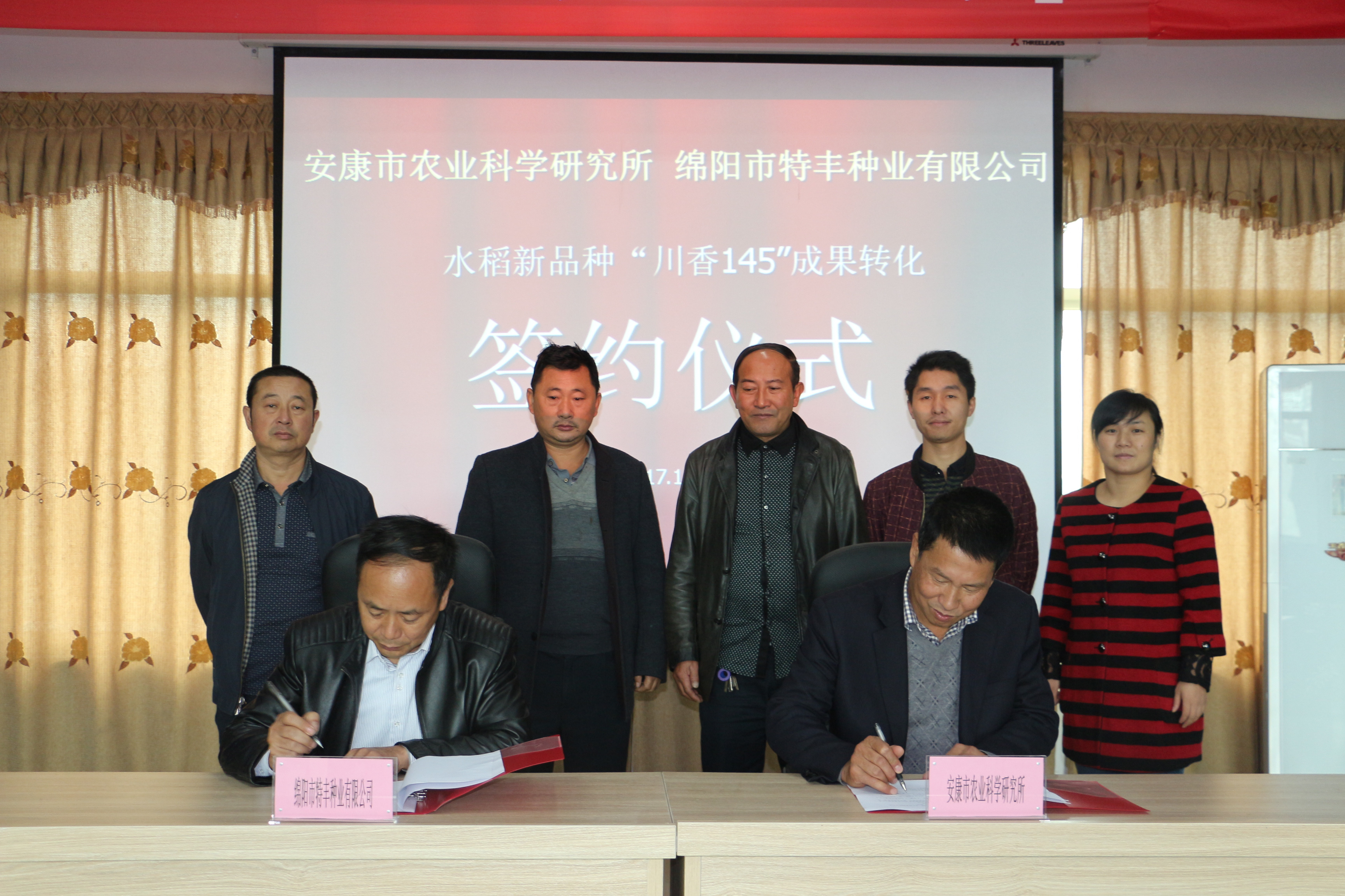 10月19日,安康市農(nóng)科所與綿陽市特豐種業(yè)有限公司就水稻新品種“川香145”的繁育權(quán)轉(zhuǎn)讓舉行簽約儀式?!按ㄏ?45”是安康市農(nóng)科所洪安喜帶領(lǐng)的創(chuàng)新專家團隊歷時多年培育的雜交水稻新品種,綿陽市特豐種業(yè)有限公司經(jīng)過多重考察對比,慎重決定購買該品種的生產(chǎn)經(jīng)營權(quán),公司負責(zé)人表示將以此次合作為契機,加大品種推廣應(yīng)用力度,發(fā)揮育推優(yōu)勢互補,實現(xiàn)所企合作共贏。