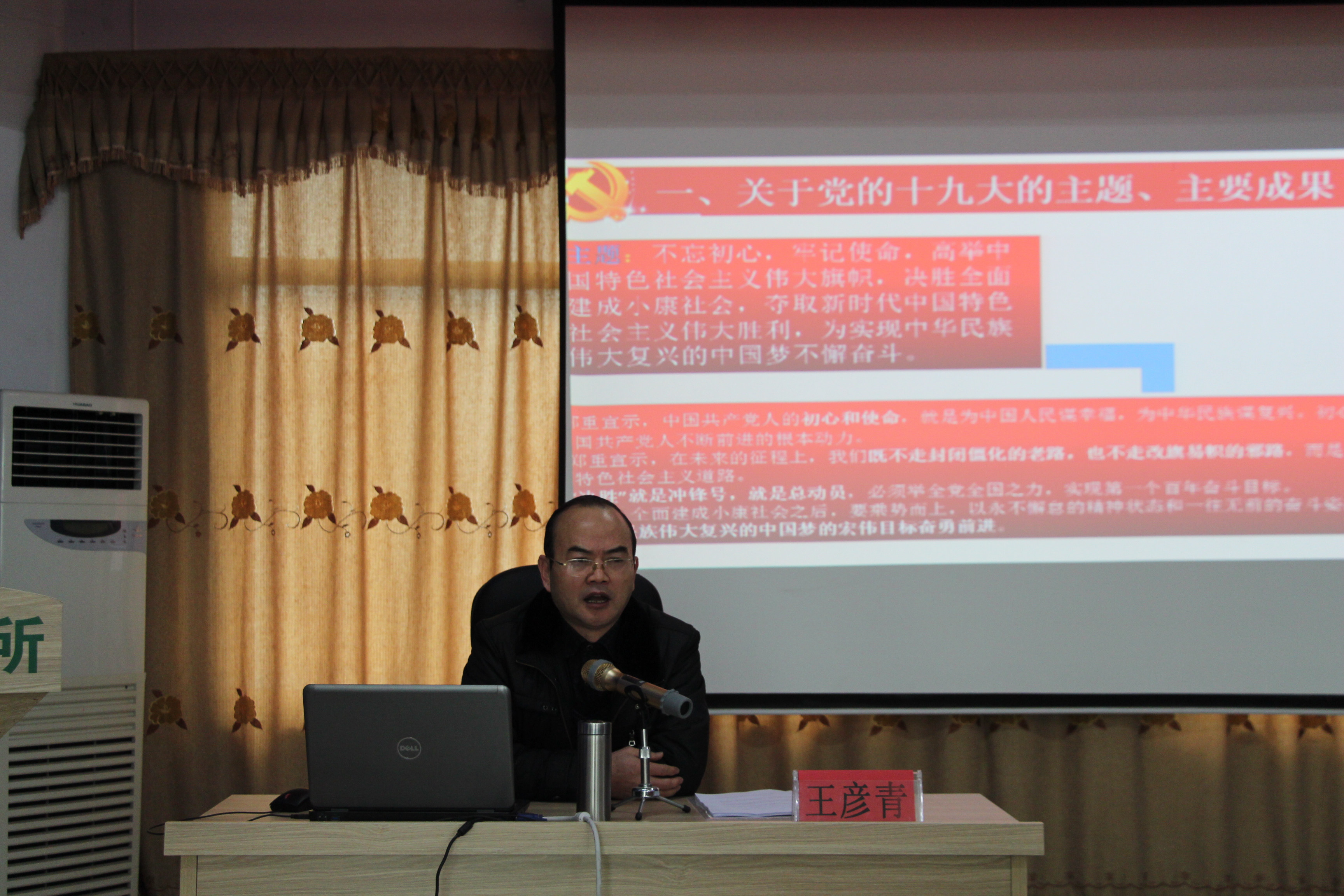 王副院長從十九大主題及主要成果、習(xí)近平新時代中國特色社會主義思想、過去五年歷史性成就和歷史性變革、中國特色社會主義進入新時代、我國主要社會矛盾的變化、兩個一百年奮斗目標戰(zhàn)略部署、我國經(jīng)濟社會發(fā)展重大戰(zhàn)略部署、堅定不移推動全面治黨八個方面做了詳細講解。