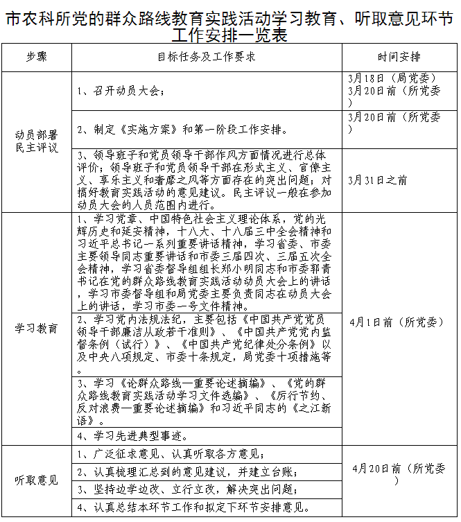 附:1、市農(nóng)科所黨的群眾路線教育實踐活動學習教育、聽取意見環(huán)節(jié)工作安排一覽表;