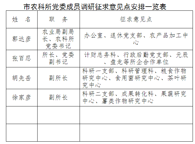 2、市農(nóng)科所黨委成員調(diào)研征求意見點安排一覽表。